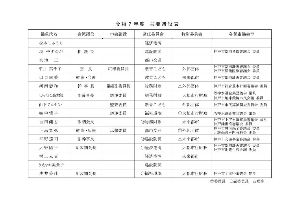 所属議員一覧 2025.08.272025.12.18 松本 しゅうじT 坊 やすなが 坊池 正 平井 真千子 山口 由美 河南 忠和 しらくに 高太郎 山下 てんせい 植中 雅子 吉田 健吾 上畠 寛弘 平野 達司 大野 陽平 村上 立真 浅井 美佳 植中 美貴子 No Results Found 諸役一覧