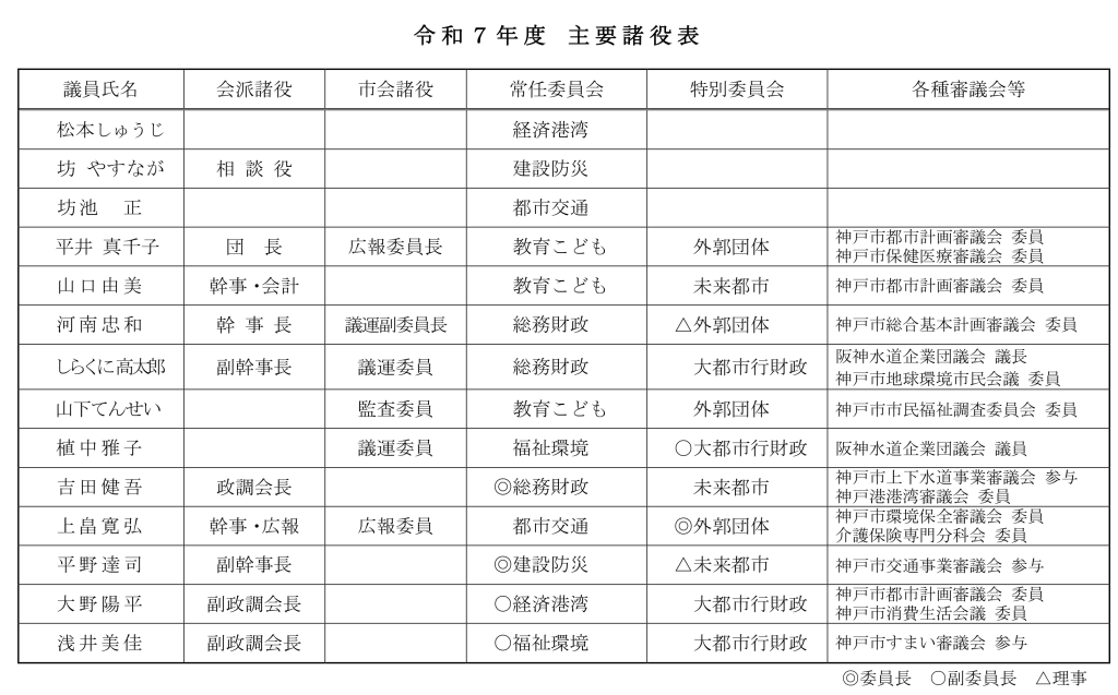所属議員一覧 2025.08.272025.09.30 松本 しゅうじ 坊 やすなが 坊池 正 平井 真千子 山口 由美 河南 忠和 しらくに 高太郎 山下 てんせい 植中 雅子 吉田 健吾 上畠 寛弘 平野 達司 大野 陽平 村上 立真 浅井 美佳 No Results Found 諸役一覧